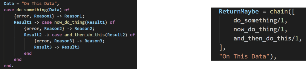 And that’s it. The above will run do_something(“On This Data”). That function will return a maybe. If it’s a just, now_do_thing(ReturnVal) will run. If that passes, and_then_do_this(ReturnVal) will then run. A maybe will be returned, which you can check for the result.
